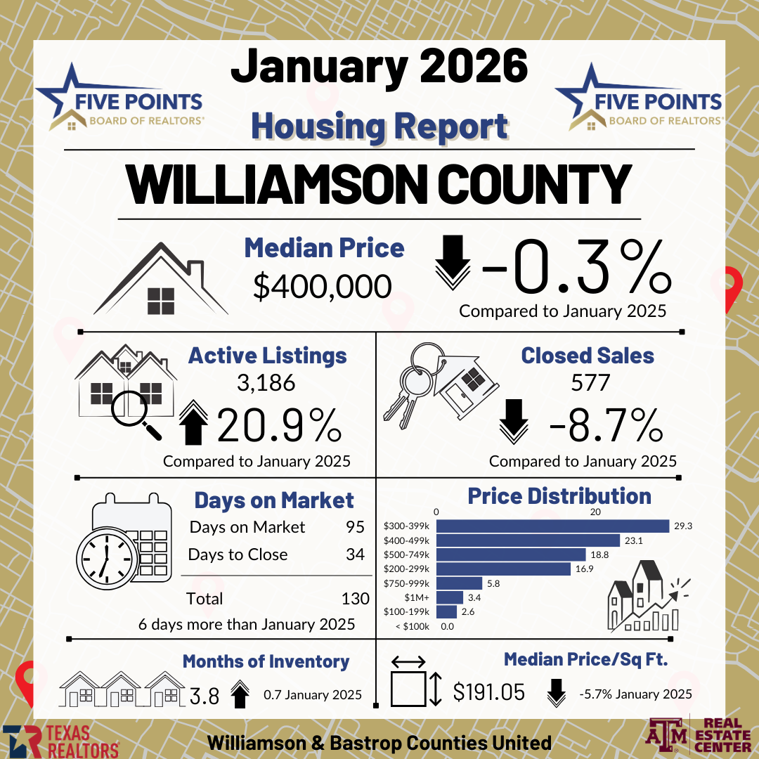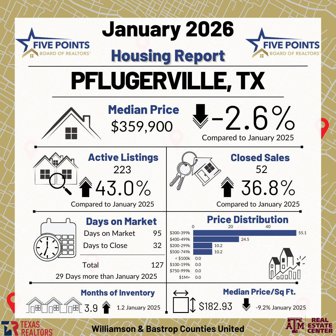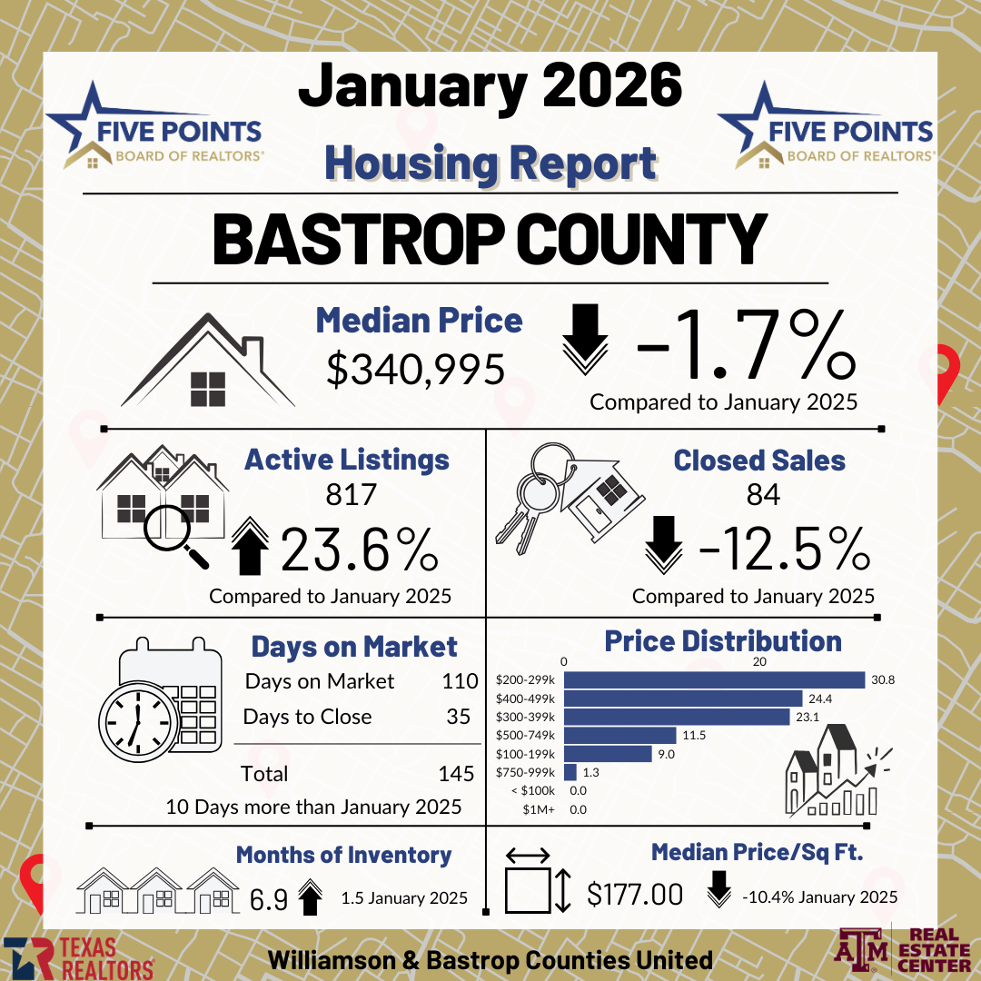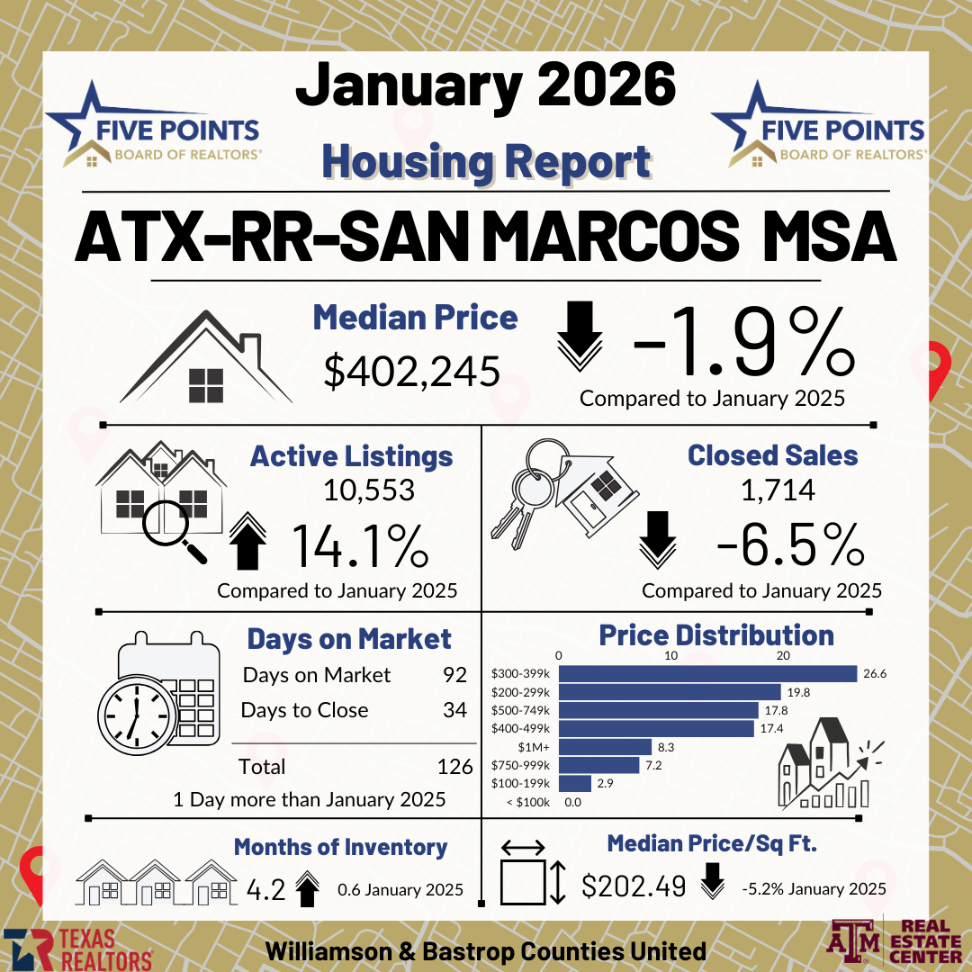 Five Points Board of REALTORS® has a partnership with the Real Estate Center at Texas A&M and Texas REALTORS® to provide monthly market reports (market stats are typically updated by the second Friday of each month). On this page you will find downloadable graphics that you can share with your clients.