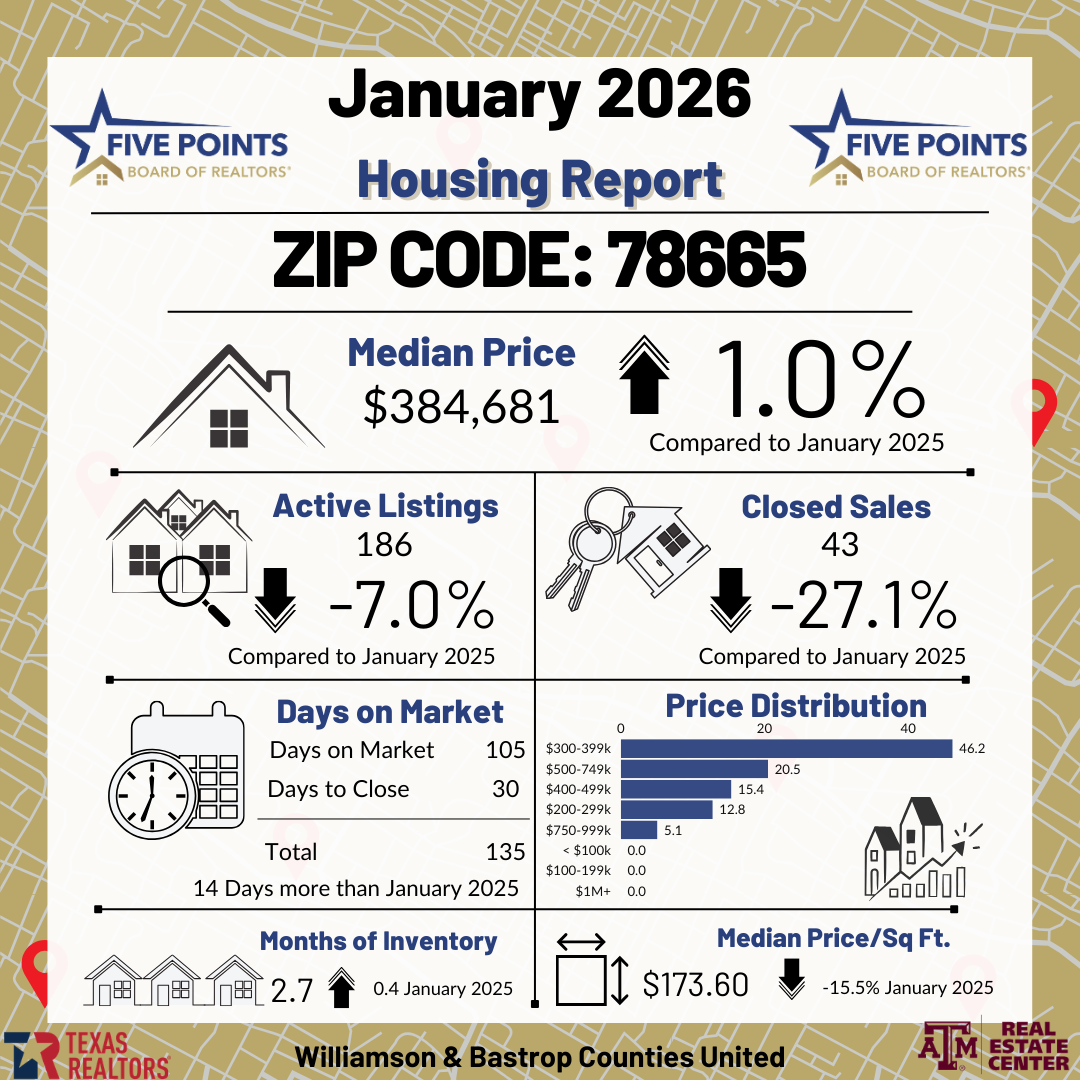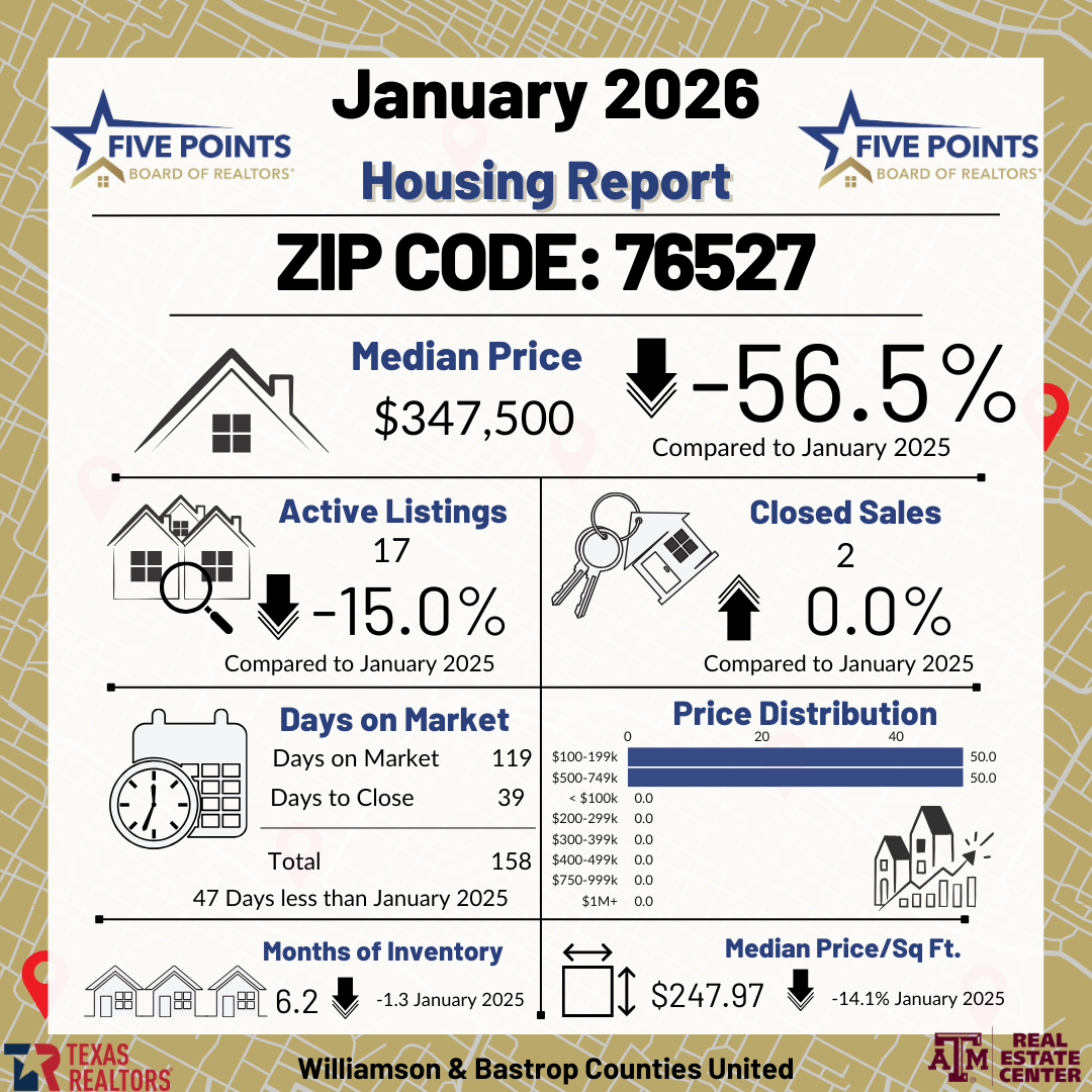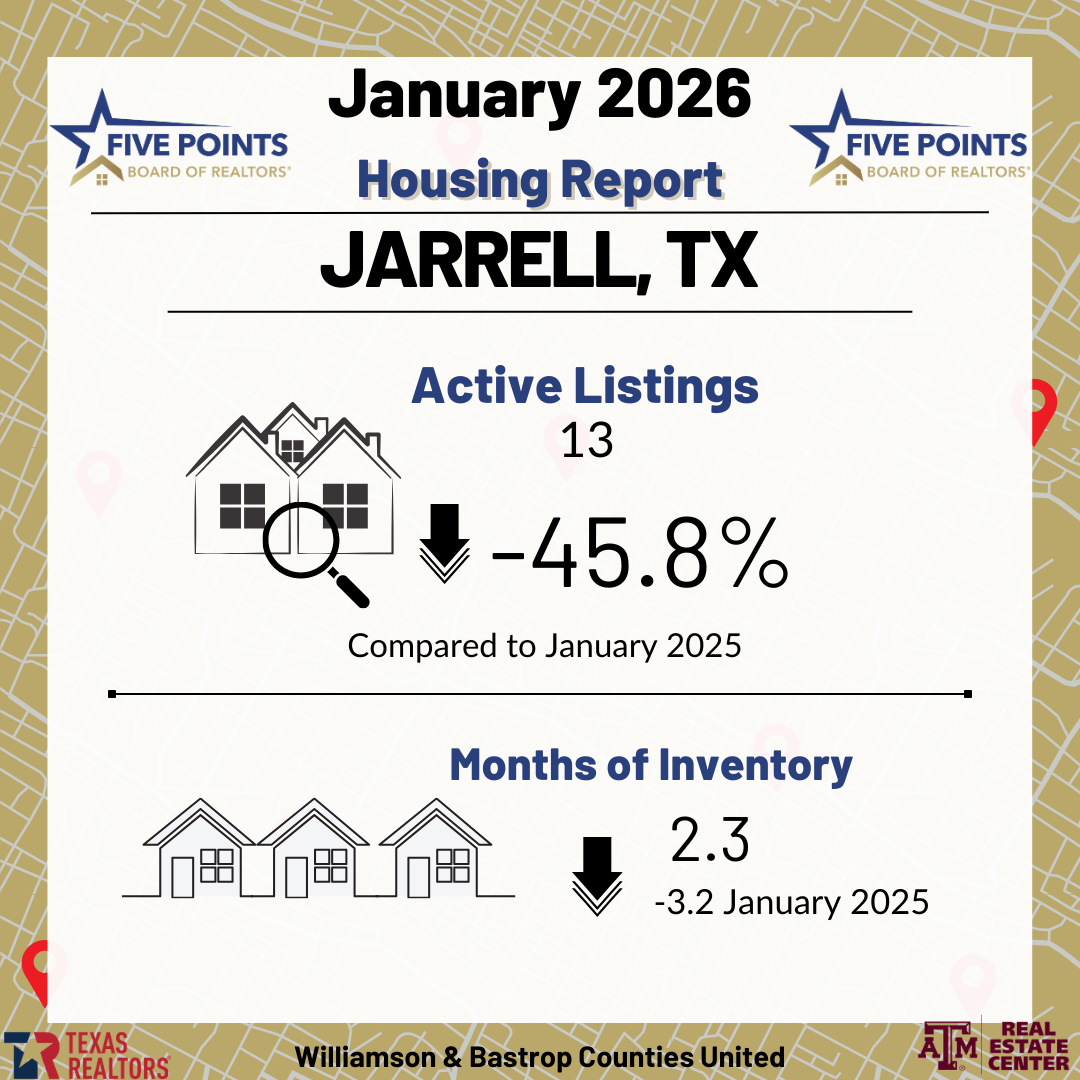 Five Points Board of REALTORS® has a partnership with the Real Estate Center at Texas A&M and Texas REALTORS® to provide monthly market reports (market stats are typically updated by the second Friday of each month). On this page you will find downloadable graphics that you can share with your clients.