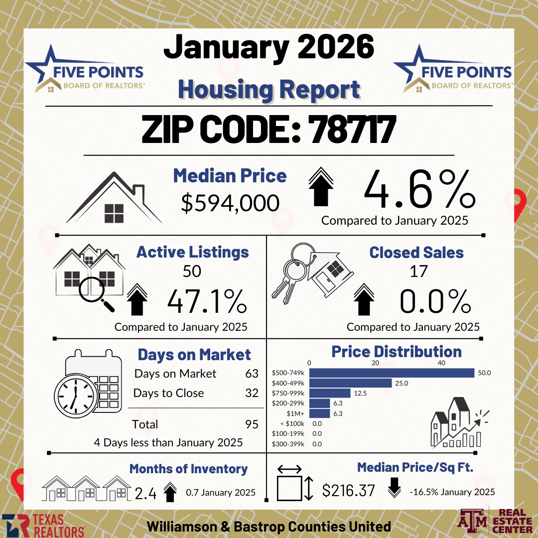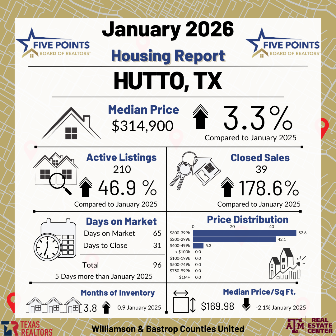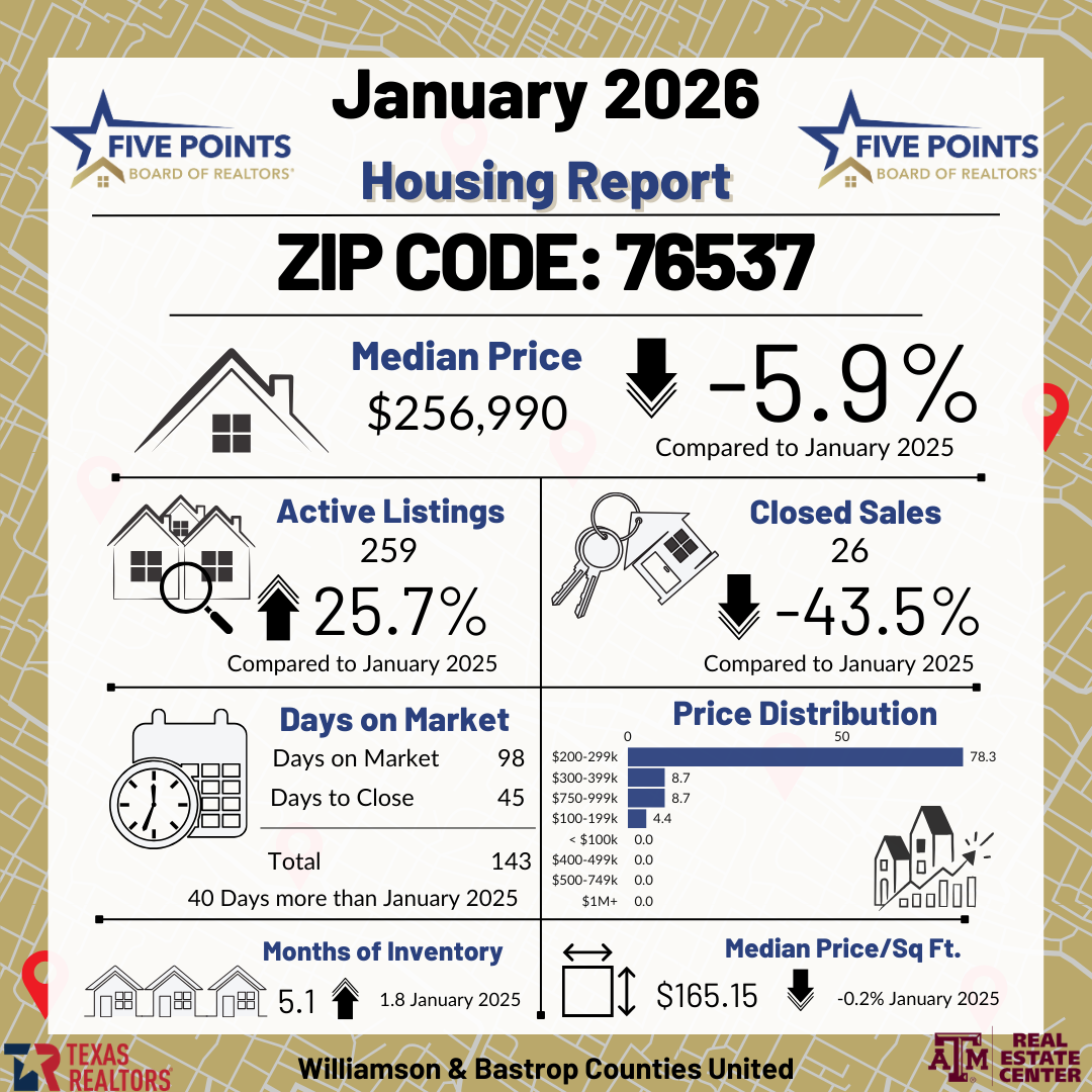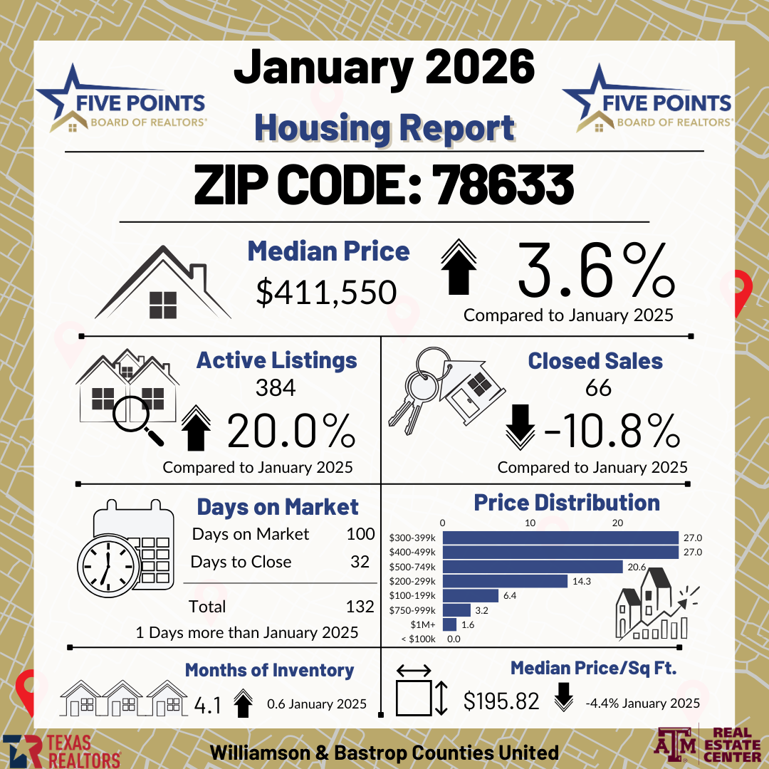 Five Points Board of REALTORS® has a partnership with the Real Estate Center at Texas A&M and Texas REALTORS® to provide monthly market reports (market stats are typically updated by the second Friday of each month). On this page you will find downloadable graphics that you can share with your clients.